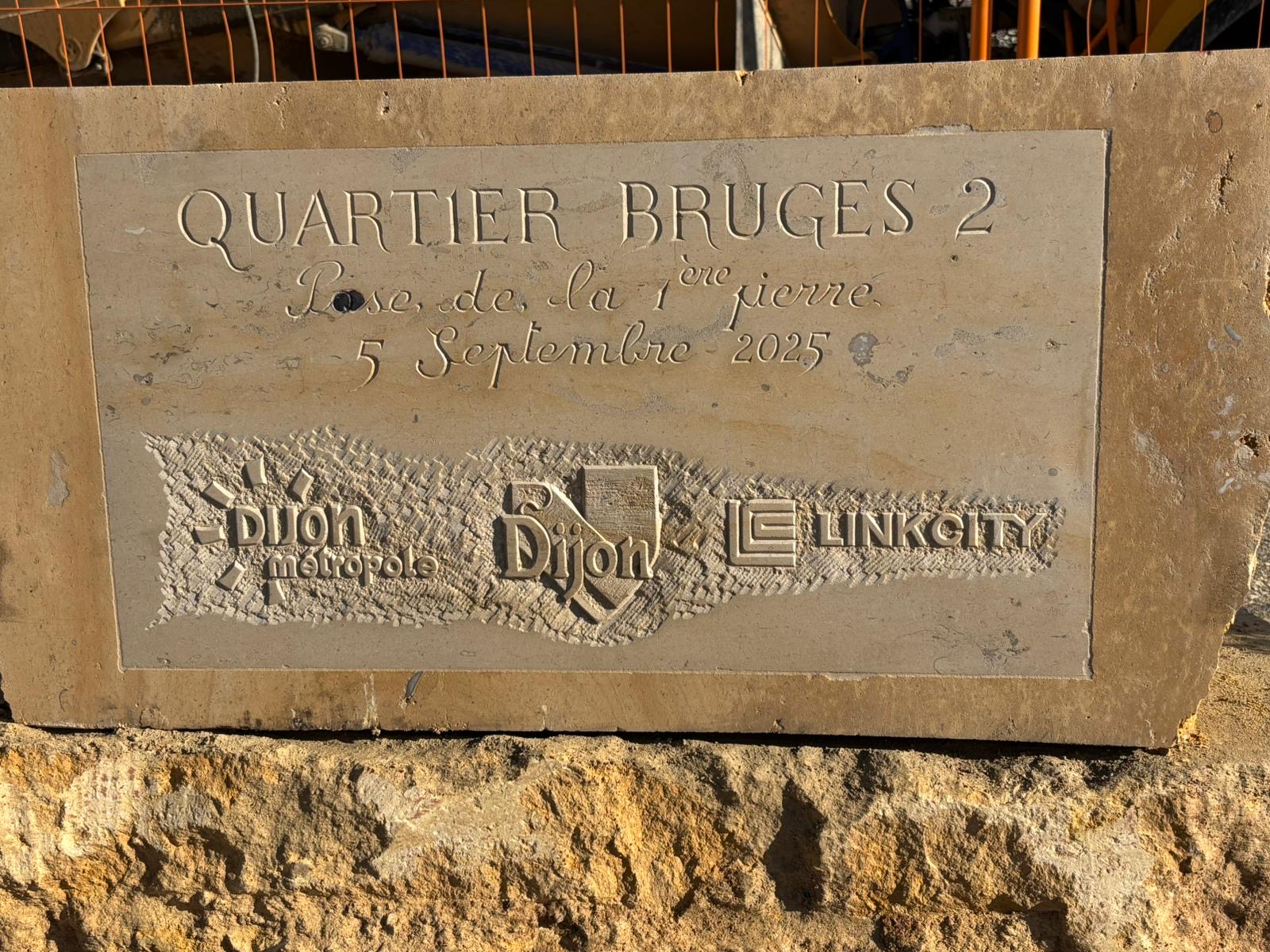 Frédéric Delabie, Directeur Nord-Est de Linkcity, Jose LIOTET, Président de Bouygues Bâtiment Nord-Est, en présence de François Rebsamen, Président de Dijon, ville et métropole et ministre de l’Aménagement du territoire et de Nathalie Koenders, maire de Dijon, ont posé la première pierre du projet urbain Bruges 2.
